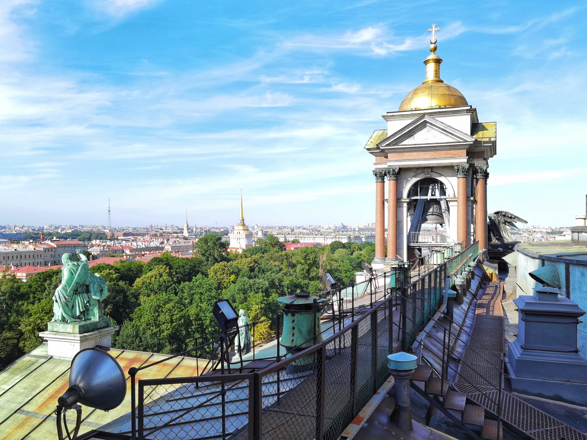 Массивный золотой купол Исаакия виден издалека и действует сразу: город узнаёт его как знакомое лицо. На переднем плане — строгие портики в духе позднего классицизма; позади — реки, каналы и городская сеть, которые собор как будто укладывает в рамку. Это не просто архитектурный акцент — это место, где история и мегаполис сходятся в одном кадре.